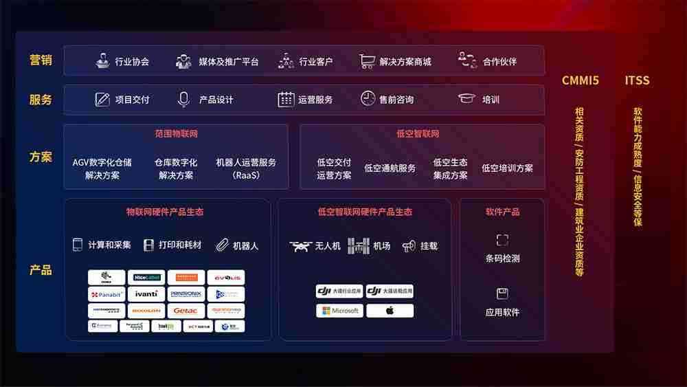 聚合国内外先进的物联网硬件产品品牌,,,,聚焦数字化仓储、、、、机器人运营、、、、低空智联网等领域,,,共同打造适合客户业务场景的解决方案并提供交付服务