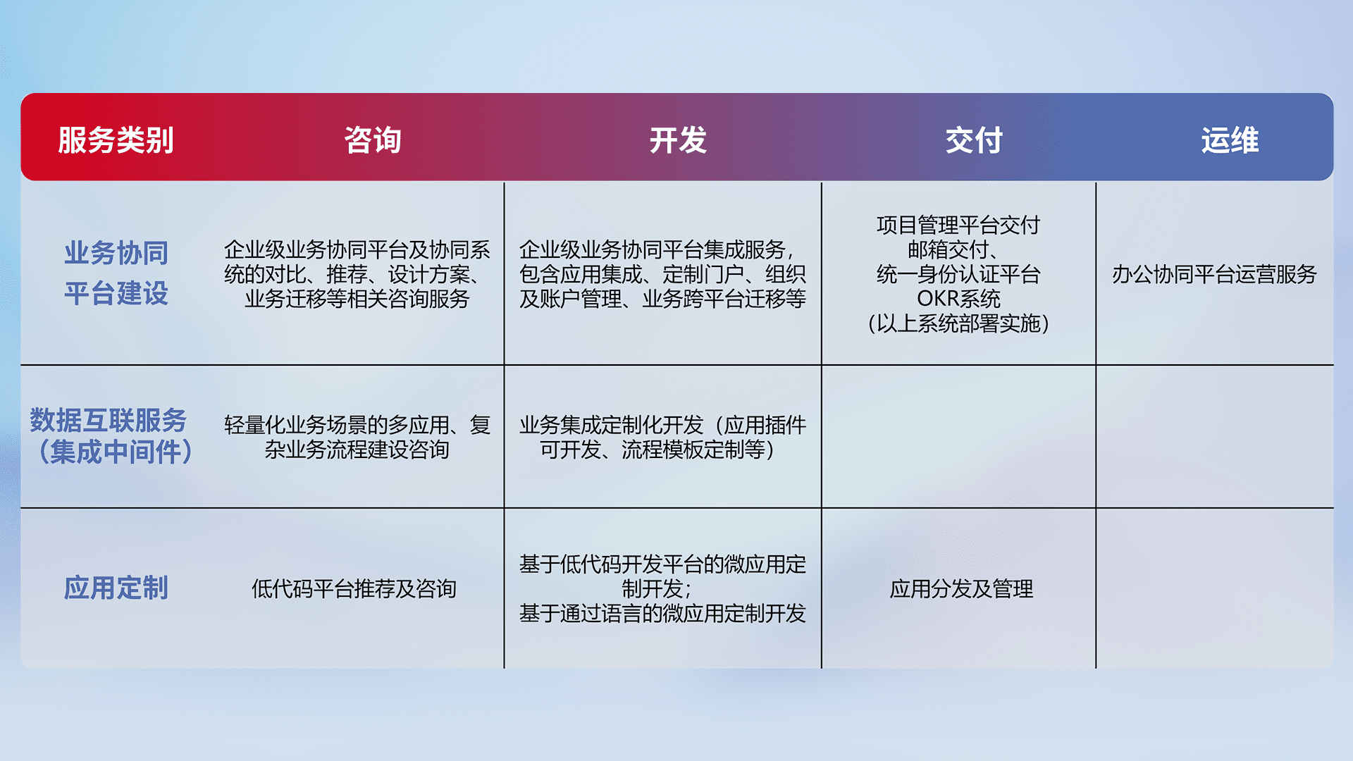 针对钉钉、、企微、、、、IDaas等平台级产品提供产品的规划、、方案、、交付、、、、定制化开发等服务,,,,实现如统一协同办公、、智能客户服务、、、、混合会议管理、、智能数据查询、、、、等业务场景,,,实现数字化转型。。。